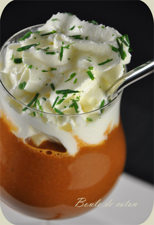 Ce gaspacho est tout simplement splen-di-de !!! On dirait un dessert avec la présentation dans le verre et la chantilly !